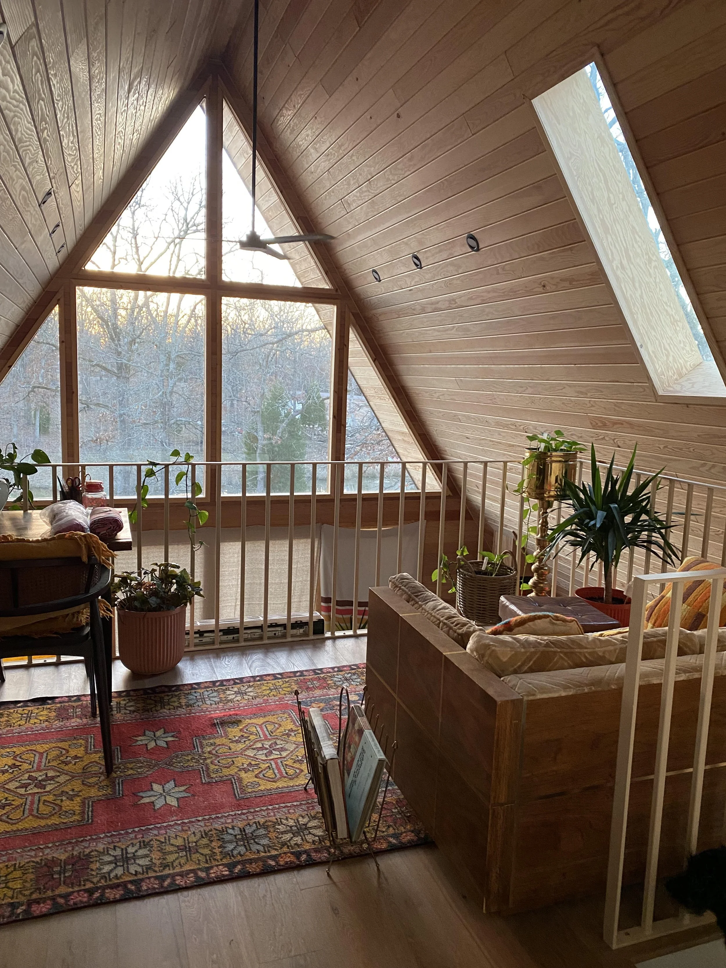 Gorgeous second floor loft can host 1/3 of your party, love seat, vintage rug & plants make this look out point a fav.